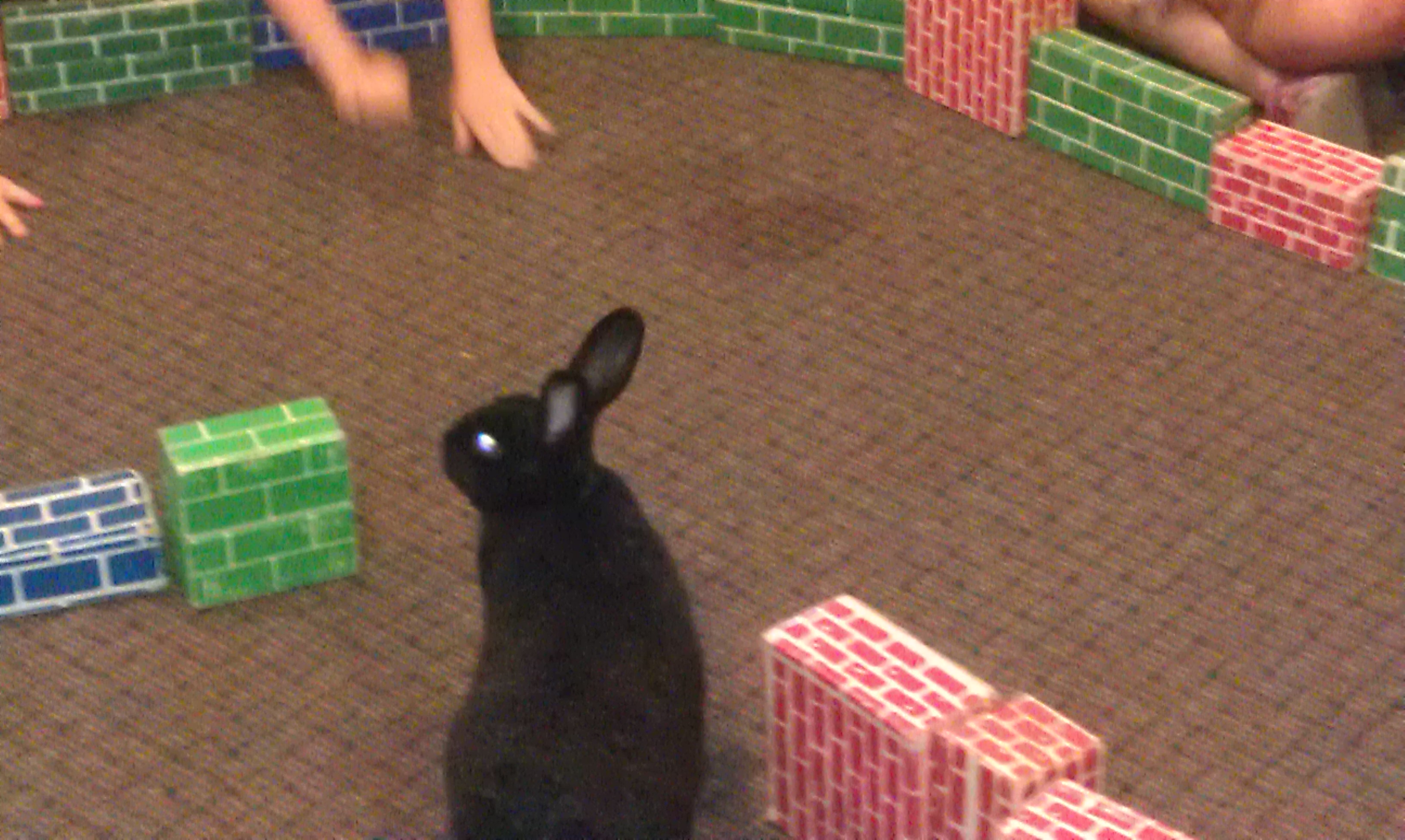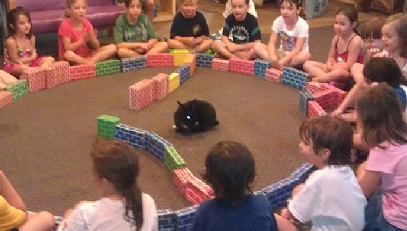 CJ is our newest resident. He is a big, black rabbit that likes to jump around and loves to be petted. This was his first visit with a group of friends in a nature activity. They build an ‘arena’ out of cardboard bricks and let him hop around to explore.
