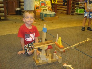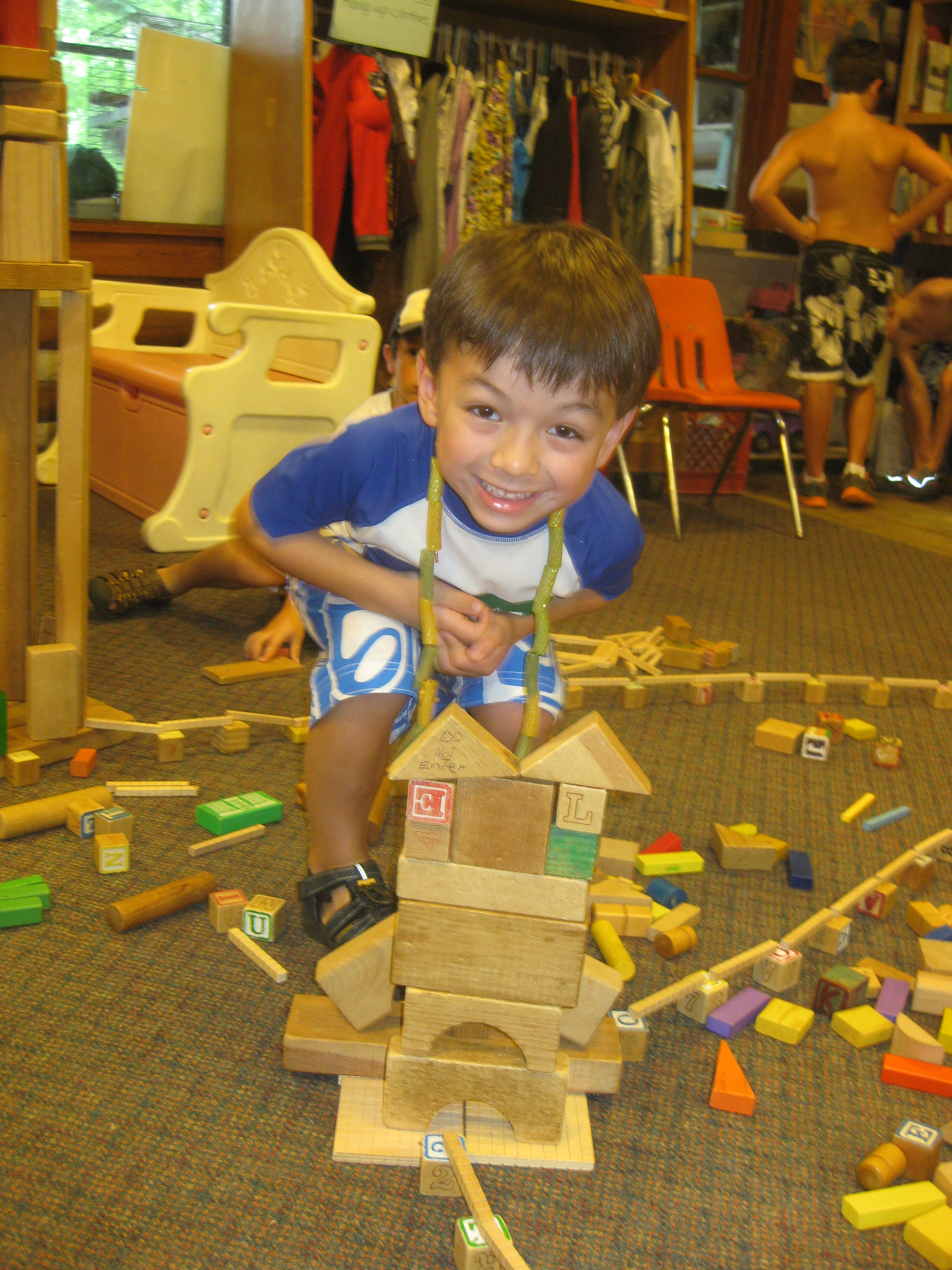 This year Frog Hollow added a new activity, Building Play. This activity consists of three large boxes of different sized blocks being dumped into the middle of the floor. Campers then build structures around the playroom, individually or together, with the common goal of creating a large city connected by roads and paths.